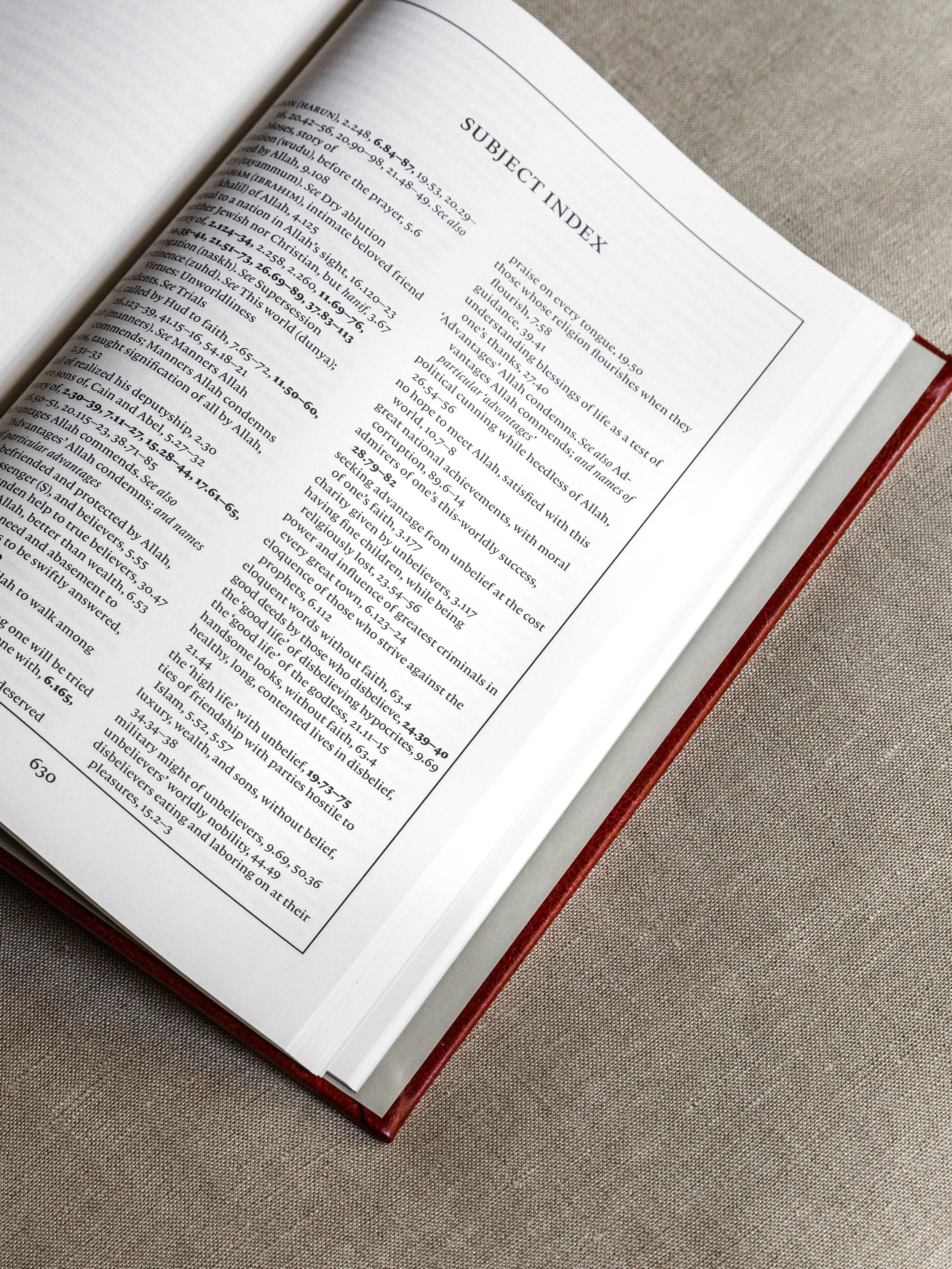 The Introduction is a brief yet rich guide to tafsir and Quranic Arabic. The Themes of the Suras conveys the overarching logic and purpose of the Revelation. The layout of the translation enhances the flow and argument of the Quran. The facing English-Arabic layout allows for a smooth and practical reading experience. The biographies of the scholars of tafsir tells us who the greatest Muslim scholars of the Quran were and how they interpreted the Quran. The massive Subject Index serves as a practical guide to one’s life. And, this translation of the Quran stands out for its elegant design, beautiful calligraphy, and attention to detail. It’s a complete package.